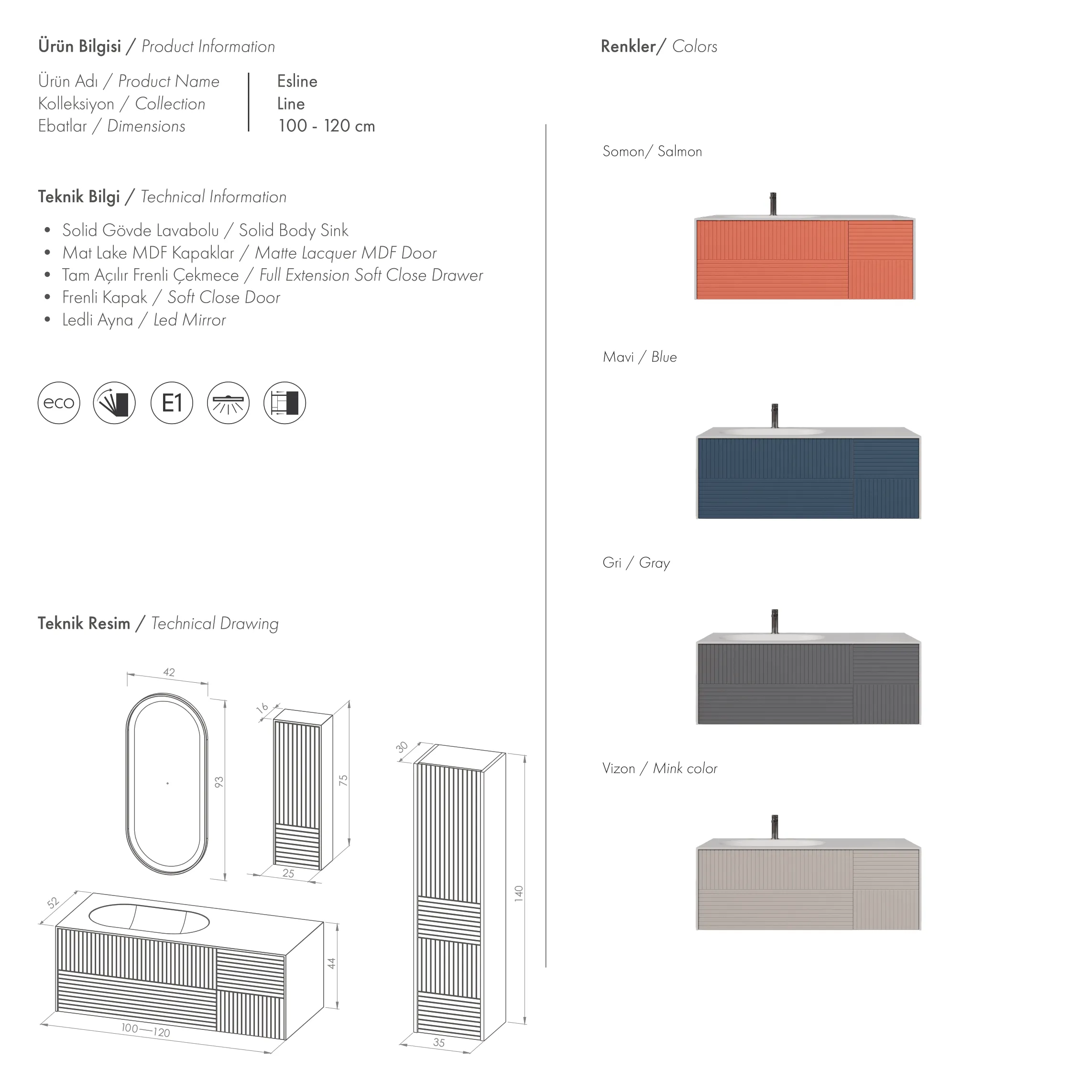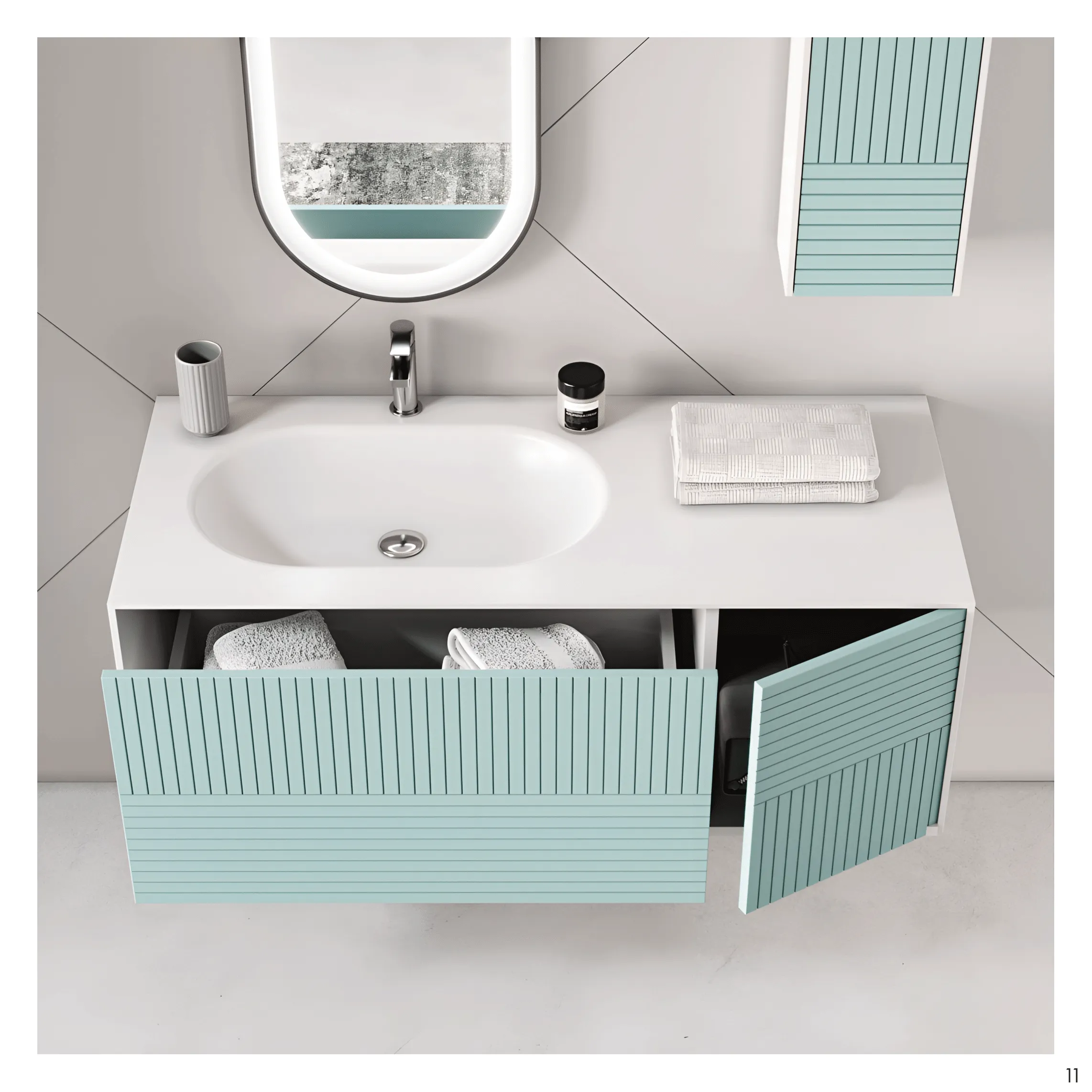 Zamansız bir şıklığın modern yorumu: Suite modeli, çizgisel dokulara sahip mat mavi yüzeyiyle banyonuza mimari bir zarafet katıyor. İkili lavabo ünitesi ve fonksiyonel depolama çözümleriyle hem estetiği hem de kullanışlılığı bir araya getiriyor. Oval LED aynalar ise seriye teknolojik bir dokunuş kazandırarak banyonuza ferah ve aydınlık bir atmosfer sunuyor. Suite ile sade çizgiler, güçlü bir duruş kazanıyor.